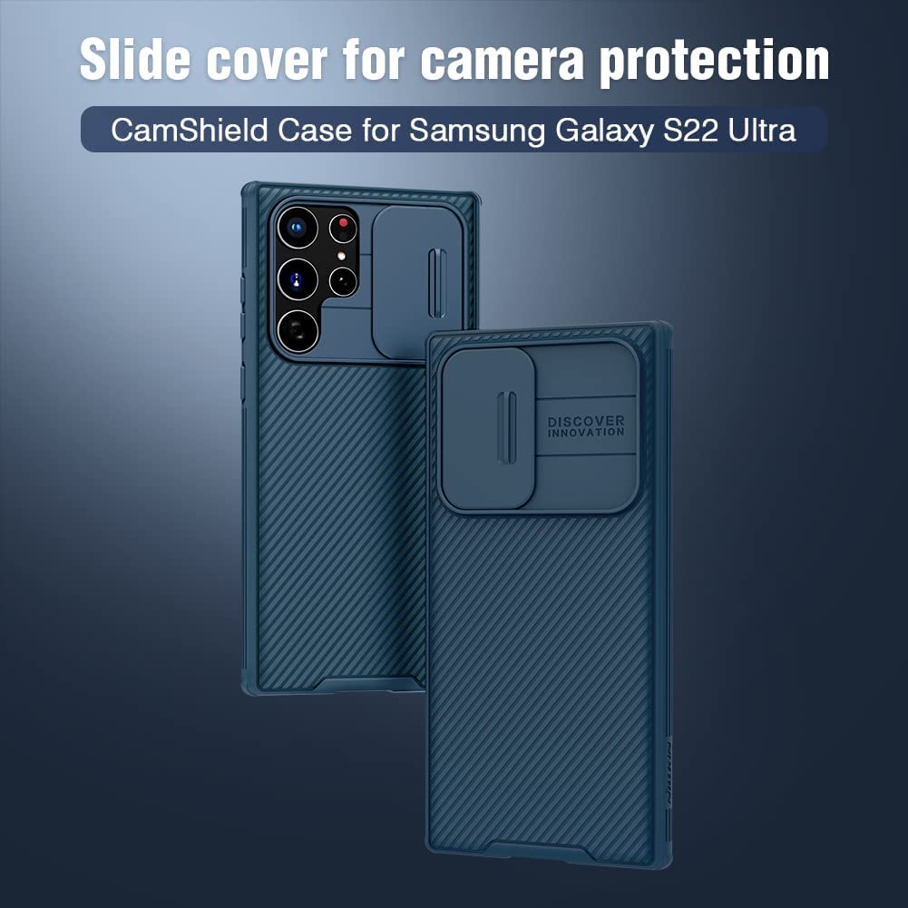 【Nillkin Camshield Case for S22 Ultra Blue】Our Samsung Galaxy S22 Ultra Slide Cover Case can protect the camera from scratching, anti-hacking voyeur, preventing from the disclosure of our privacy. With this S22 Ultra case built-in lens cover, no longer needed glass camera protector.